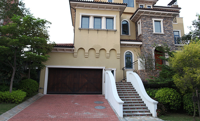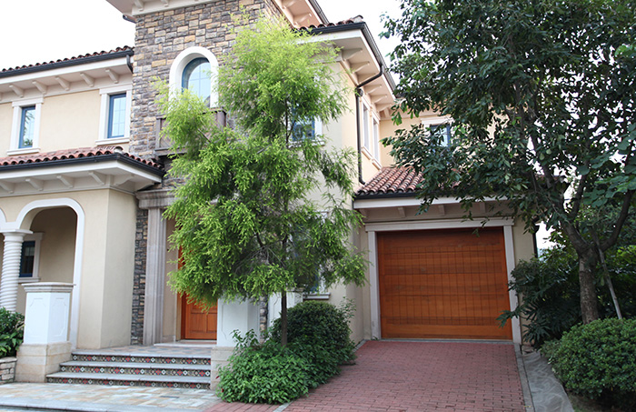 2、提升档次:从结构上来说,实木车库门门板的背面为“田”字形铝架,结合了铝架的轻巧,实木的自然风格,提升别墅档次,与别墅的风格自然融为一体。